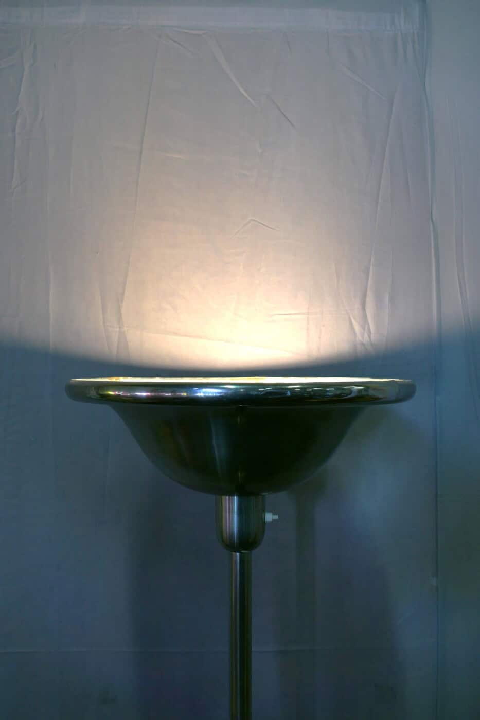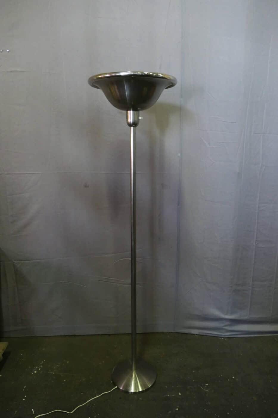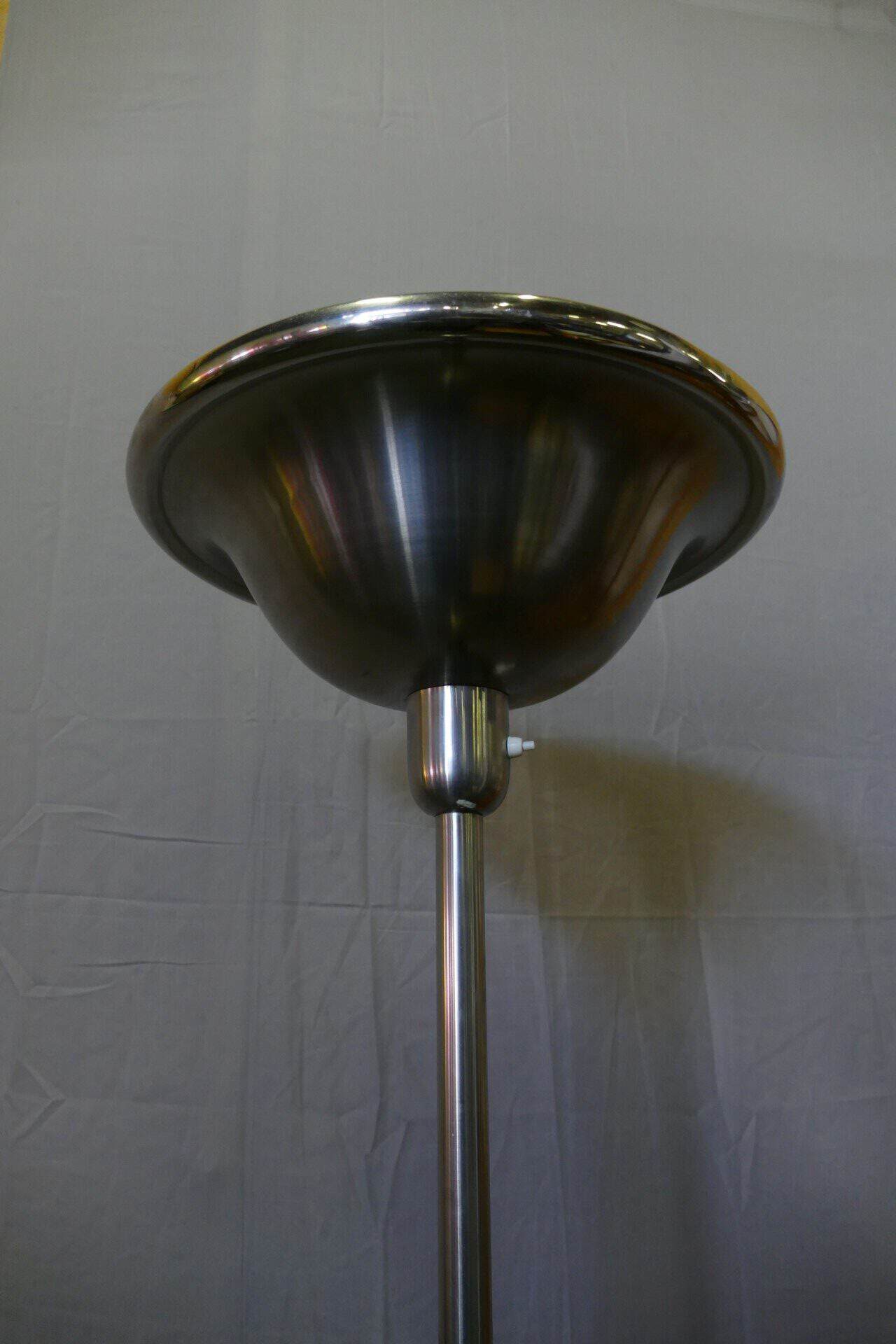 Art Deco vloerlamp met vernikkelde messing kap Twee E27 fittingen, schakelaar onder de kap. Afmetingen hoog 173, diameter kap 44 en diameter voet 28 cm.