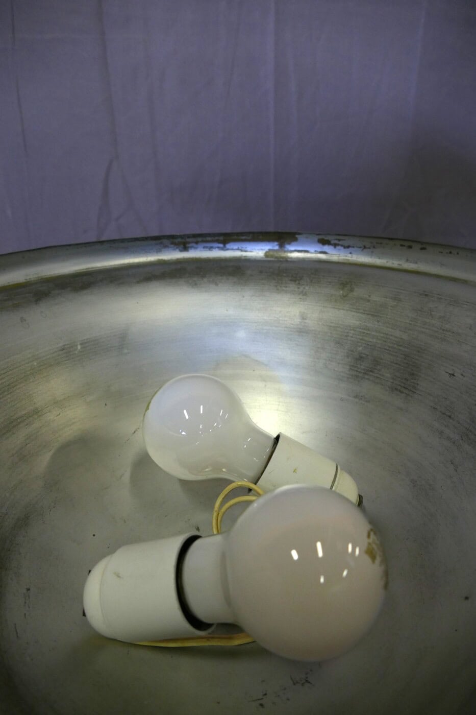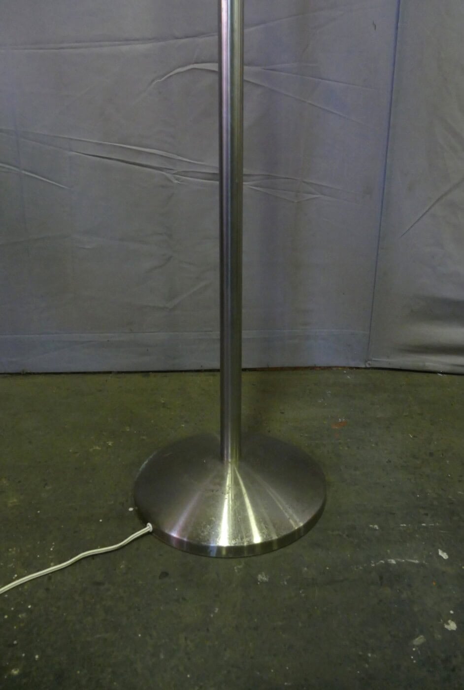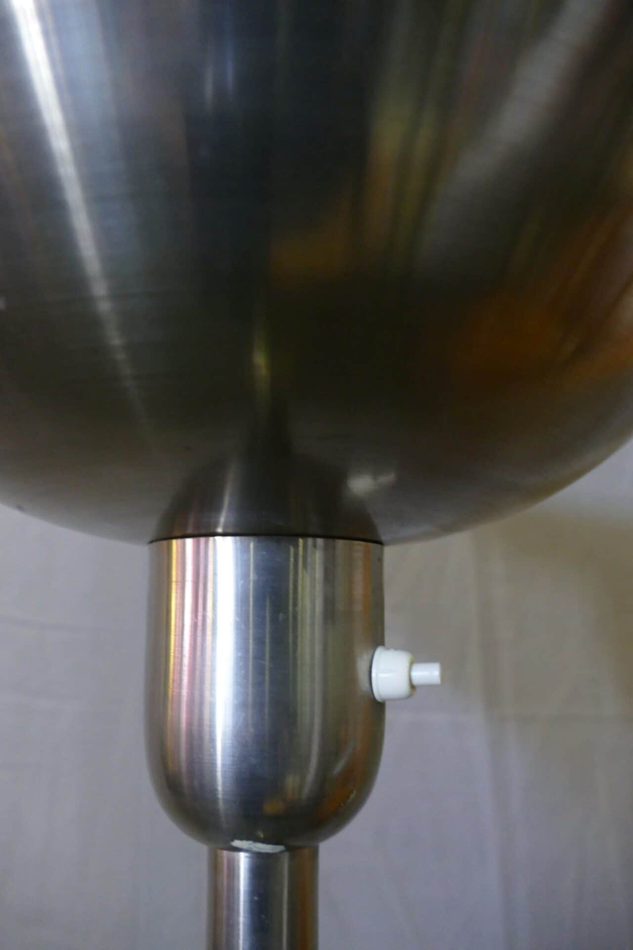 Art Deco vloerlamp met vernikkelde messing kap Twee E27 fittingen, schakelaar onder de kap. Afmetingen hoog 173, diameter kap 44 en diameter voet 28 cm.