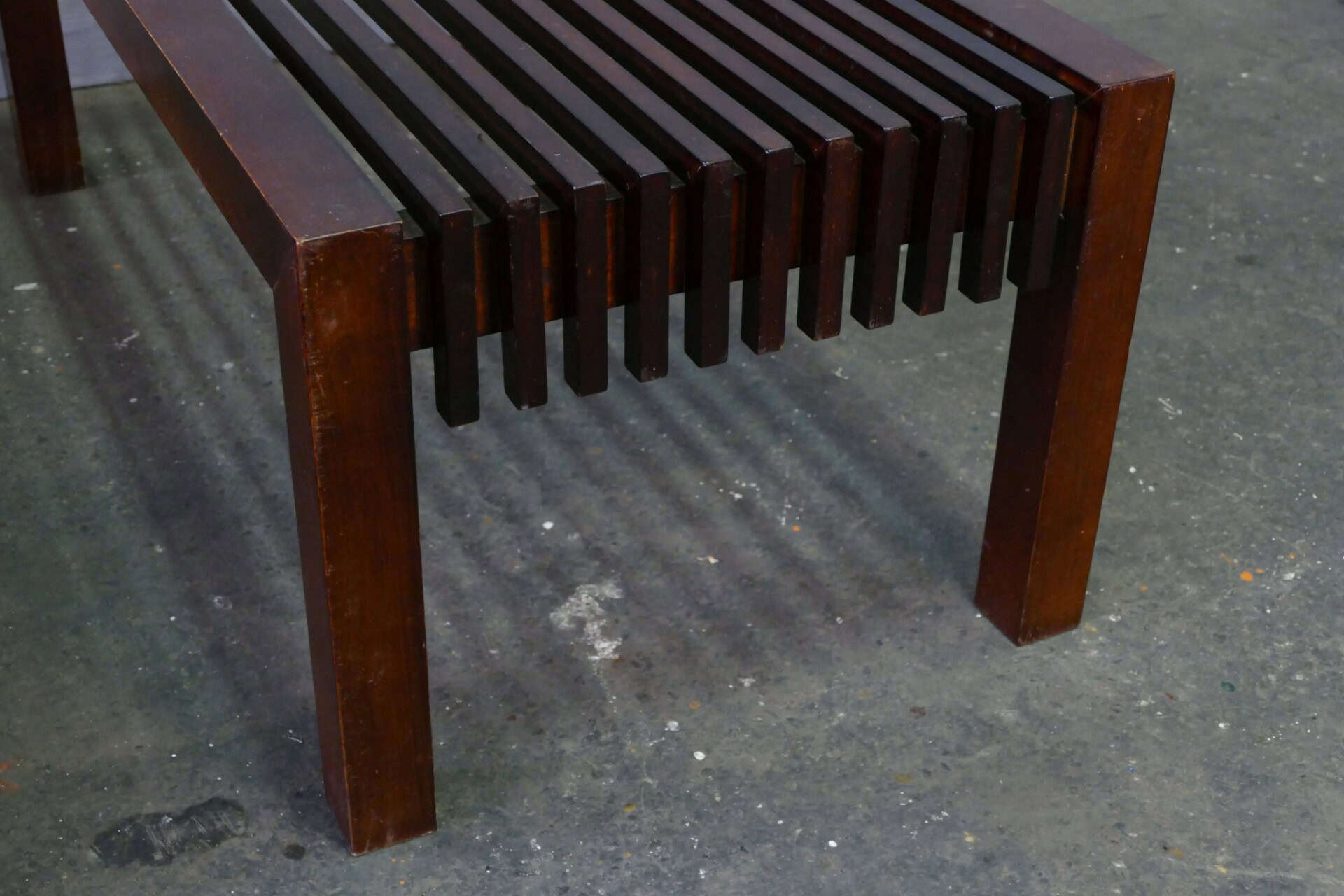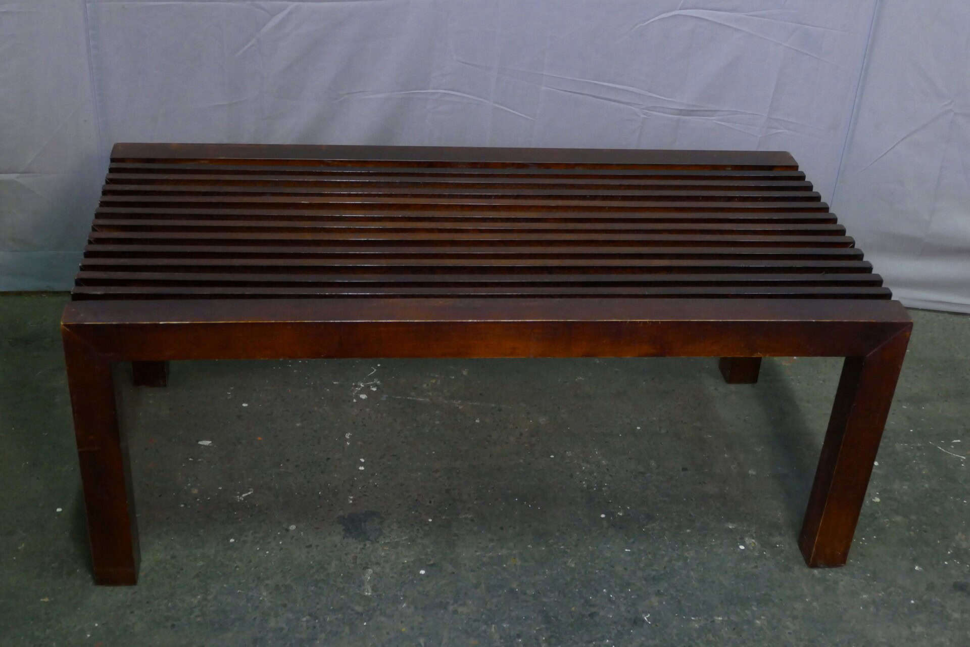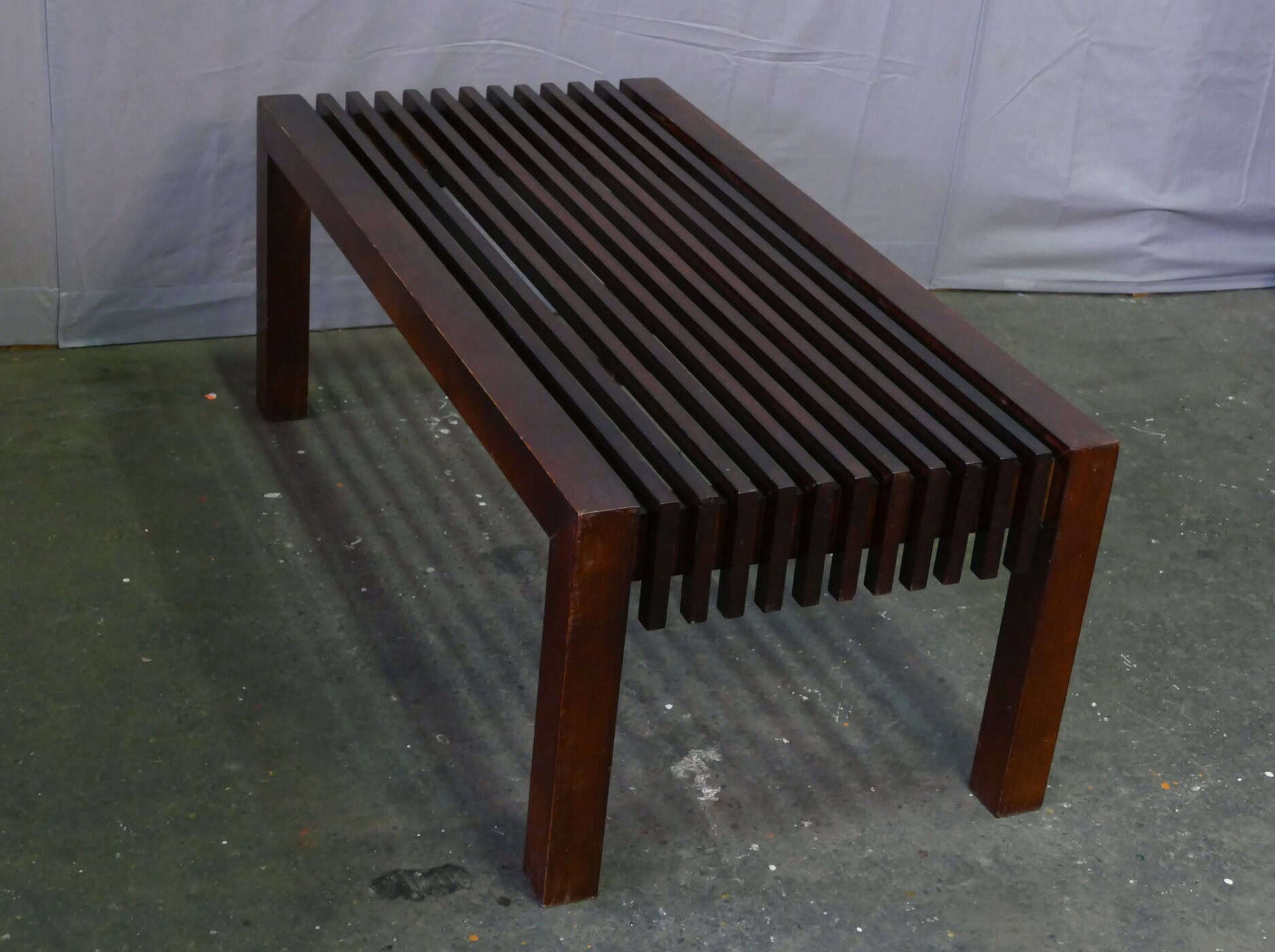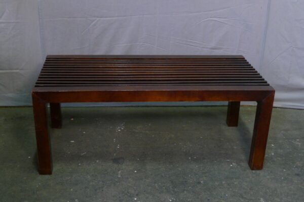 Donker gebeitste  notenhouten lattentafel. De verticaal aangebrachte latjes aan de uiteinden suggereren een staande plank.