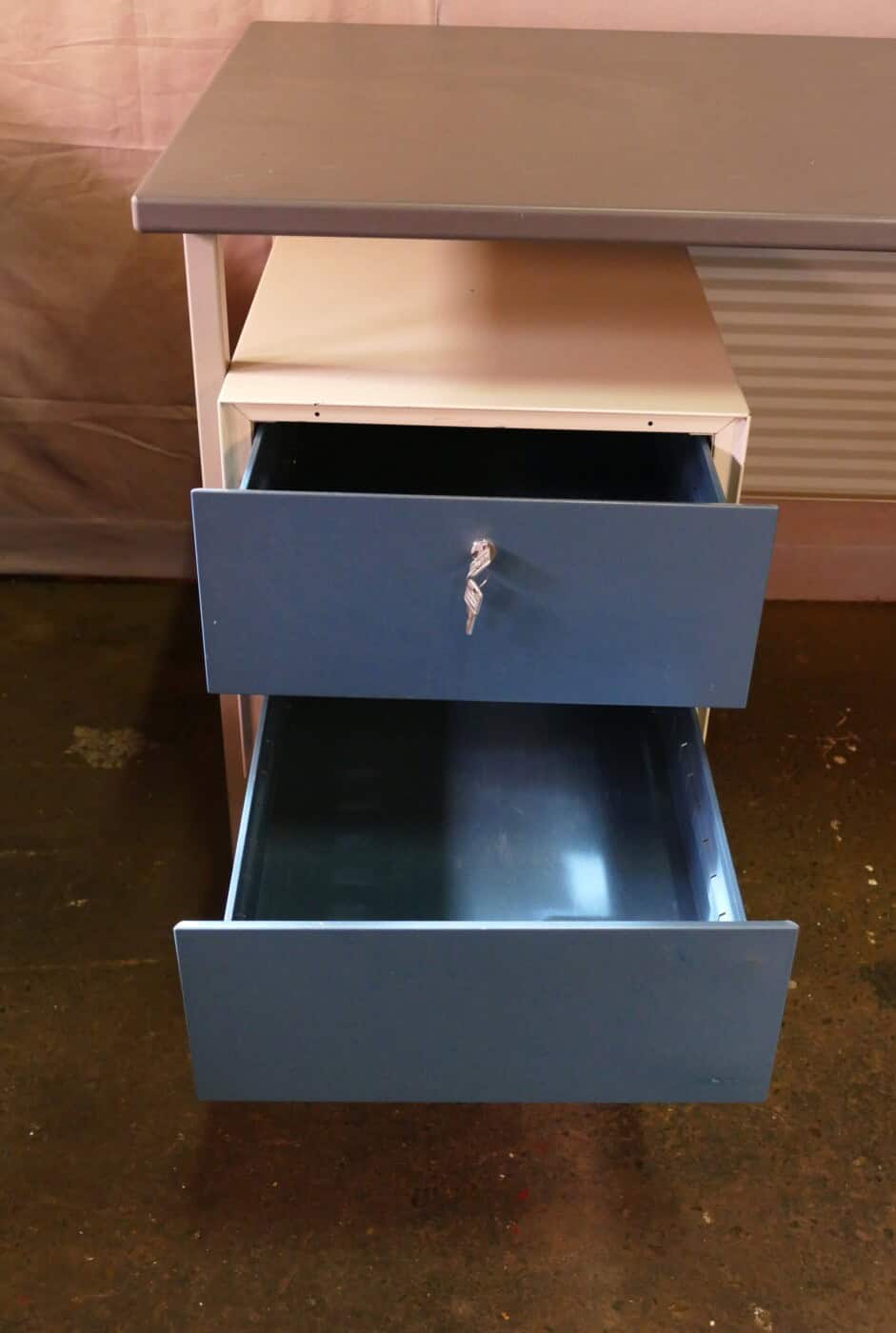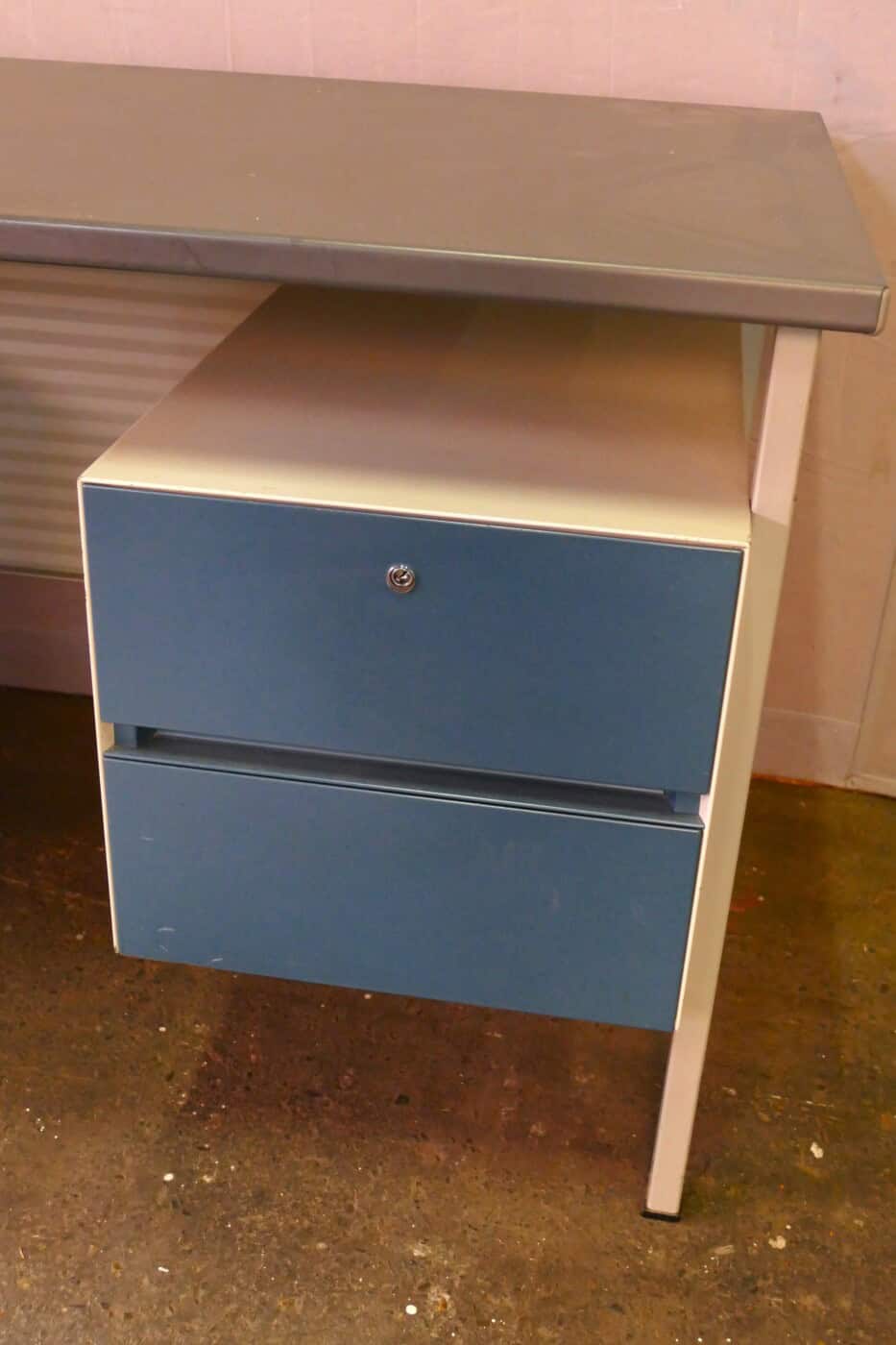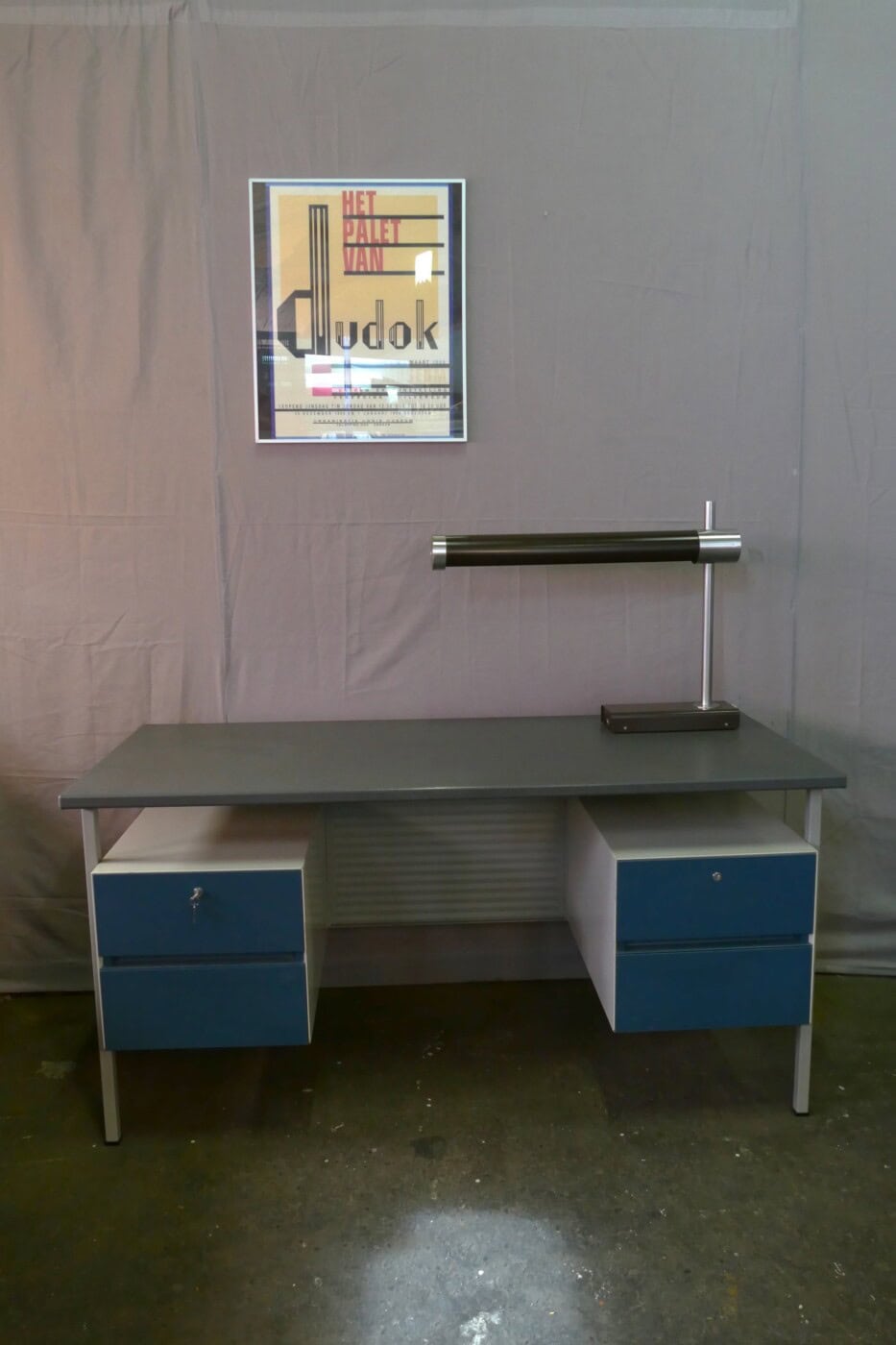 A.R. Cordemeijer voor Gispen: bureau model 3807 in lichtgrijs met blauw. Met originele sleutels. Afmetingen breed 150, diep 65 en hoog 74,5 cm. Collectie Kleurodesk.