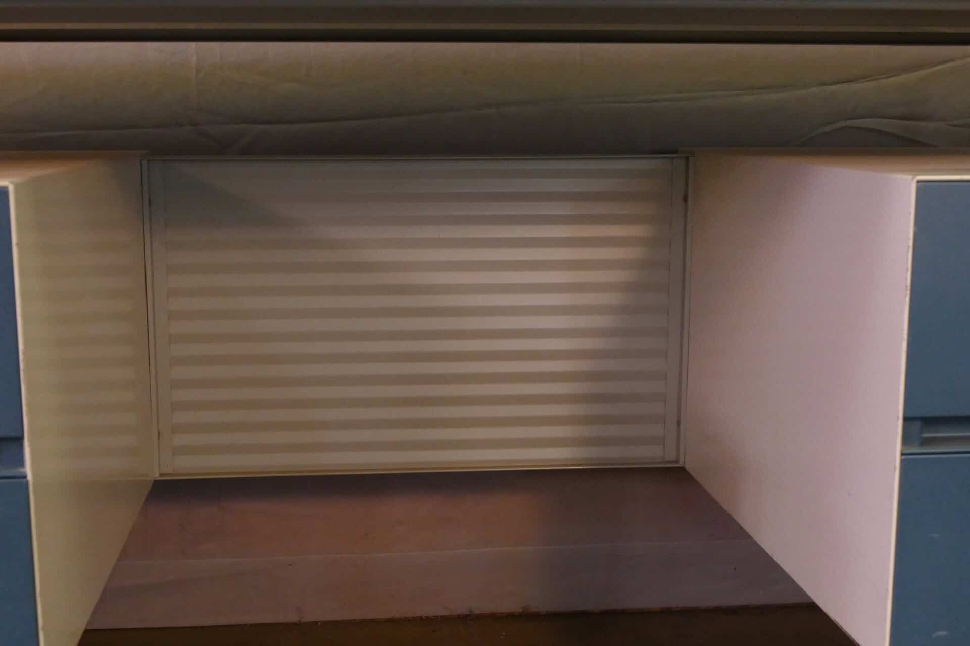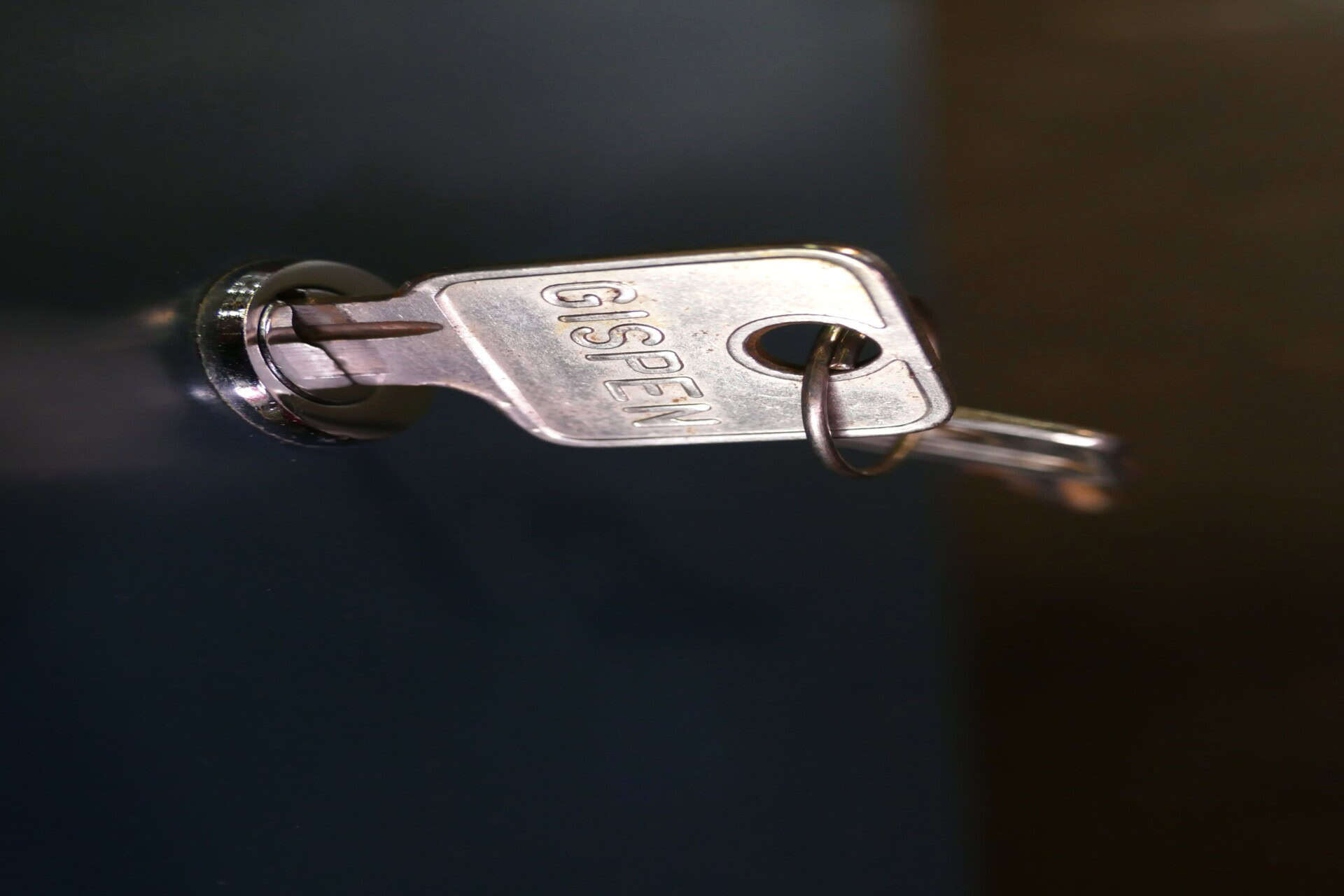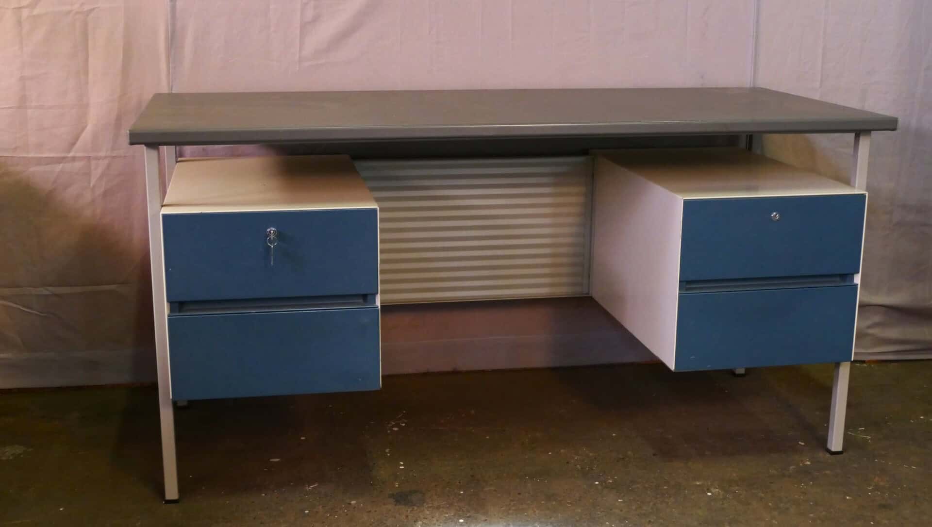 A.R. Cordemeijer voor Gispen: bureau model 3807 in lichtgrijs met blauw. Met originele sleutels. Afmetingen breed 150, diep 65 en hoog 74,5 cm. Collectie Kleurodesk.