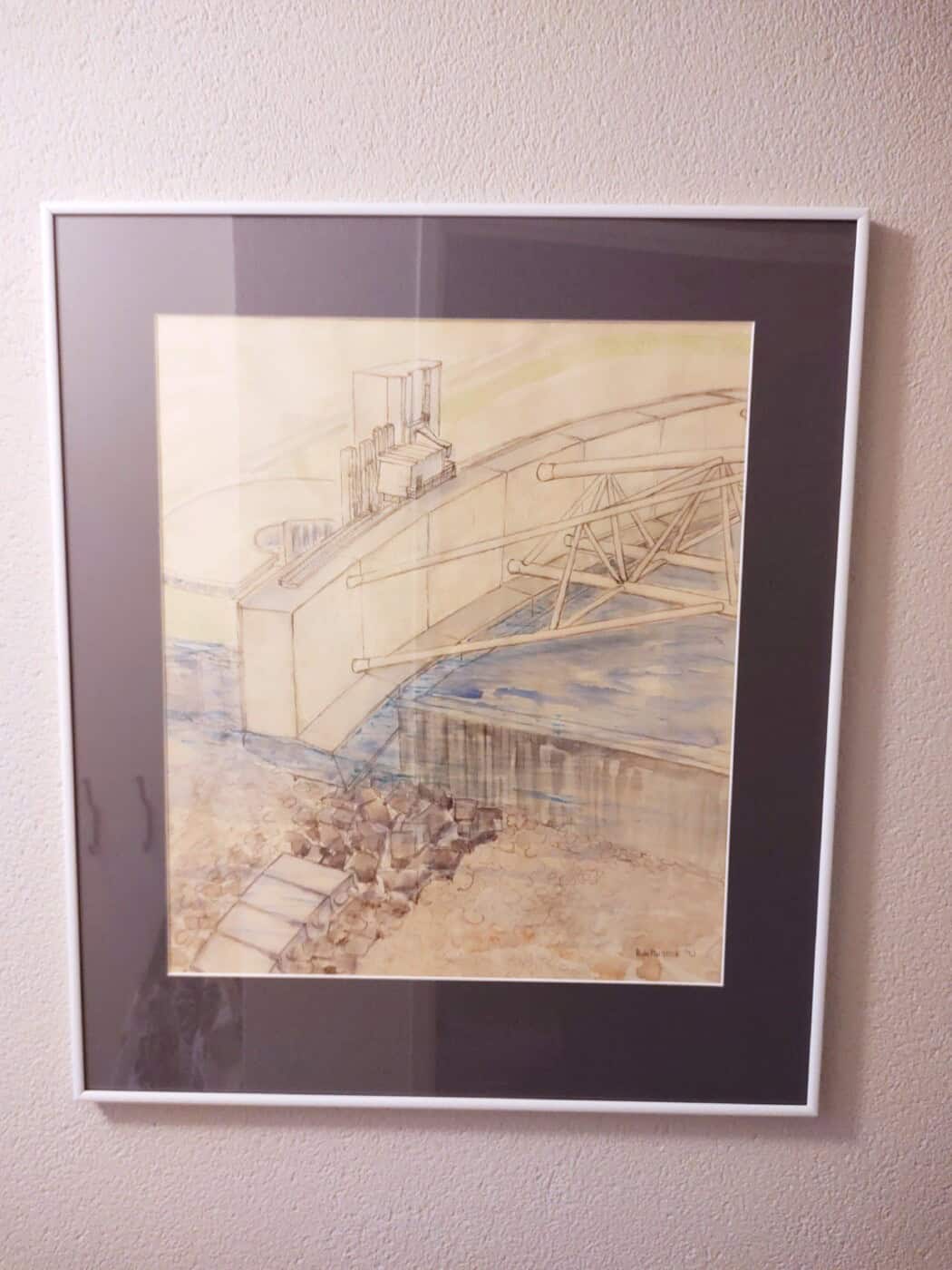 Tekening/aquarel van een detail van de Maeslantkering in de Nieuwe Waterweg door H. de Muijnck. De Maeslantkering is het sluitstuk van de Deltawerken. Voorzien van nieuw passepartout en glas. afmetingen lijst 60 x 70 cm.