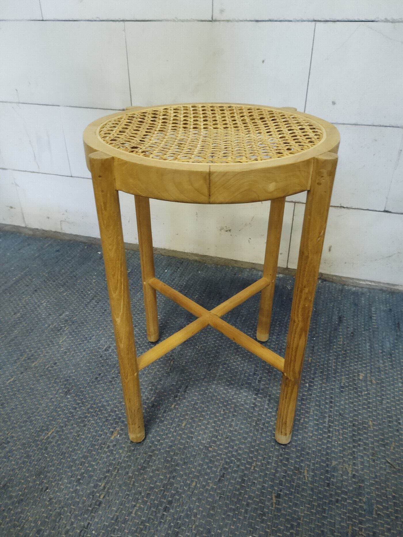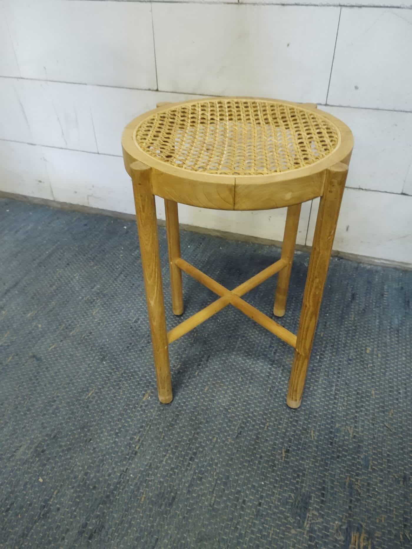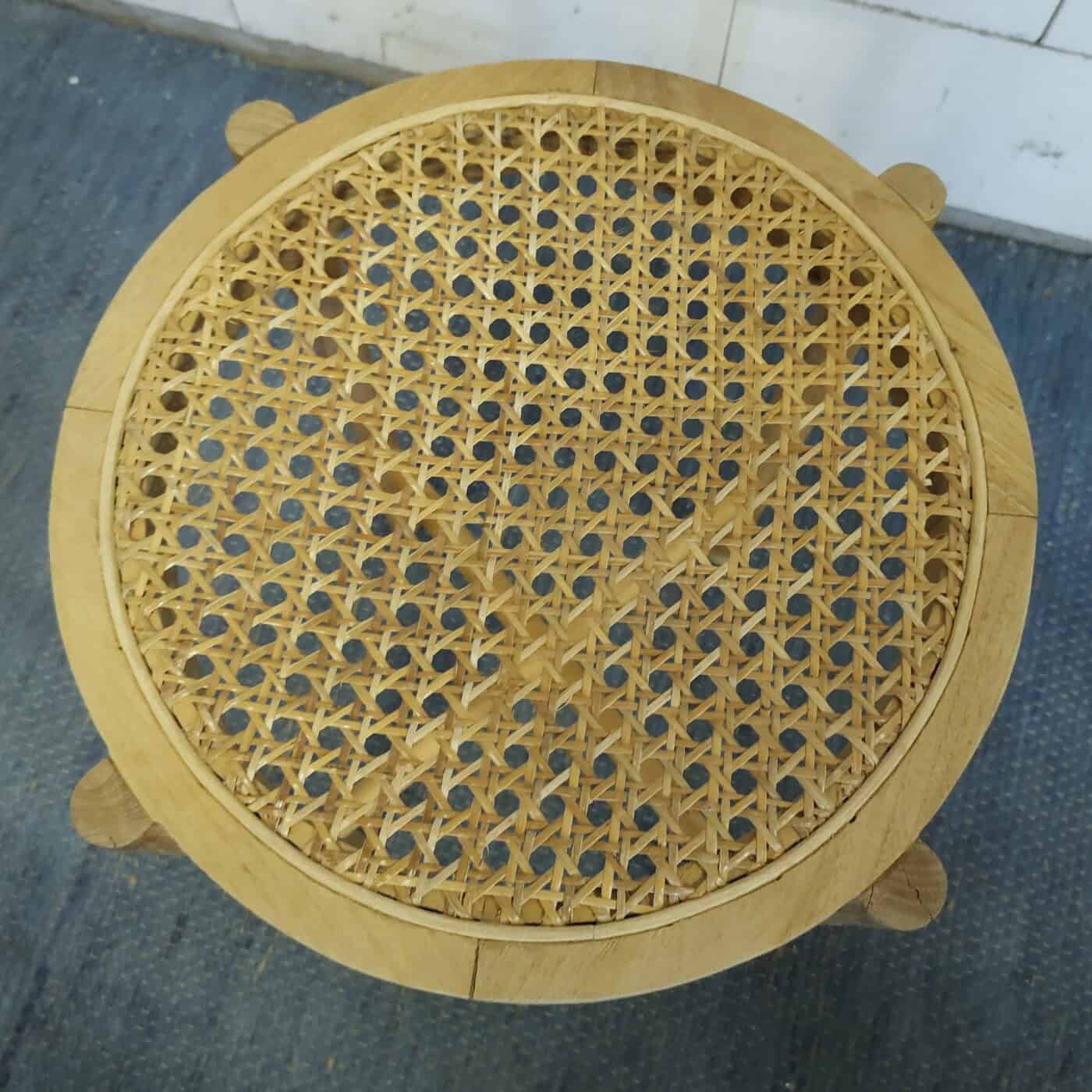 Leuk retro design krukje in hout en pitriet webbing van HK living. Kan ook als bijzettafeltje fungeren. Afmetingen diameter 35 en hoogte 50 cm.