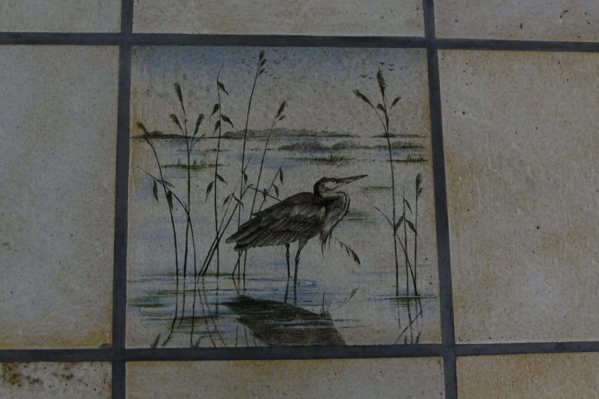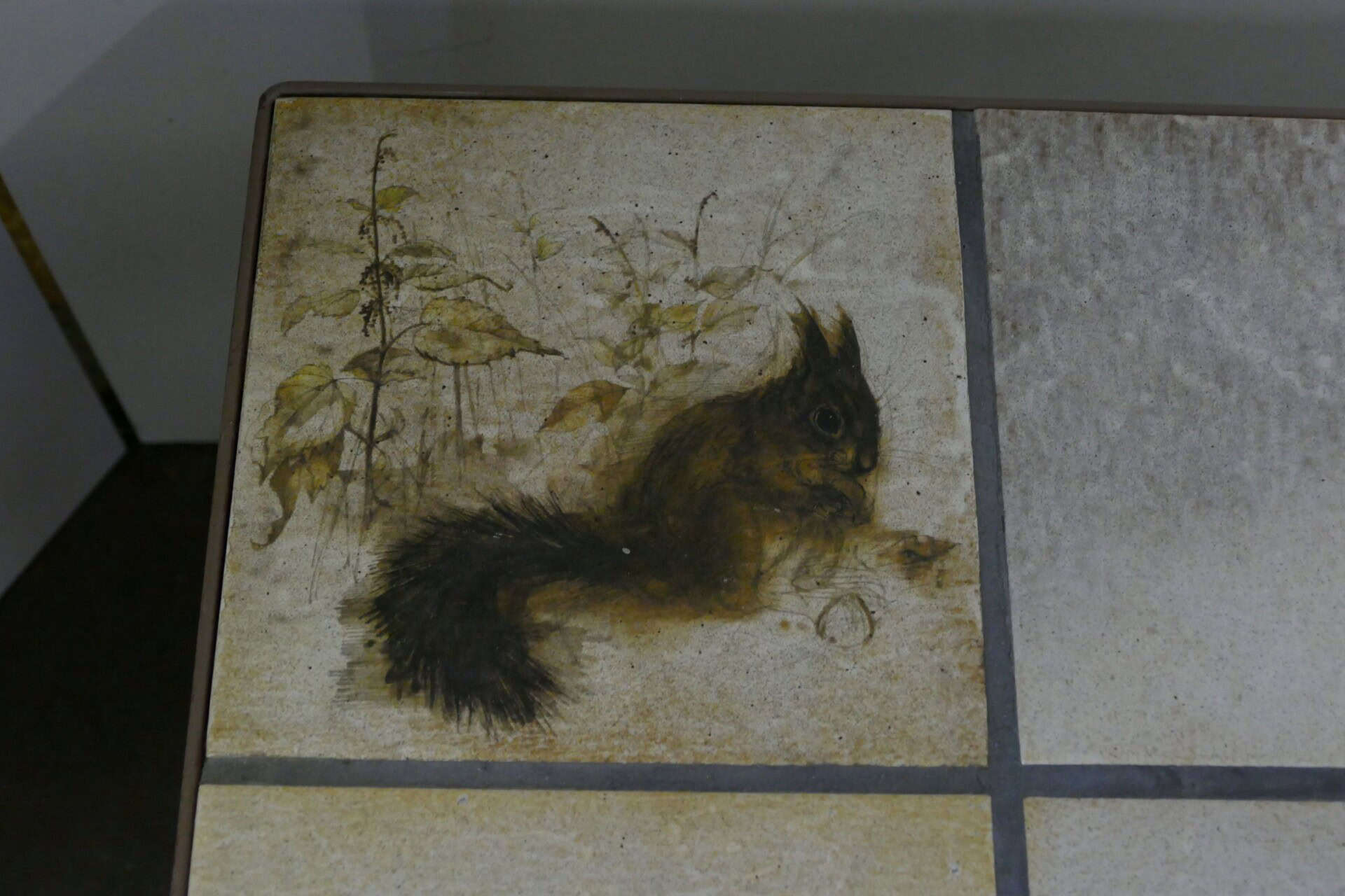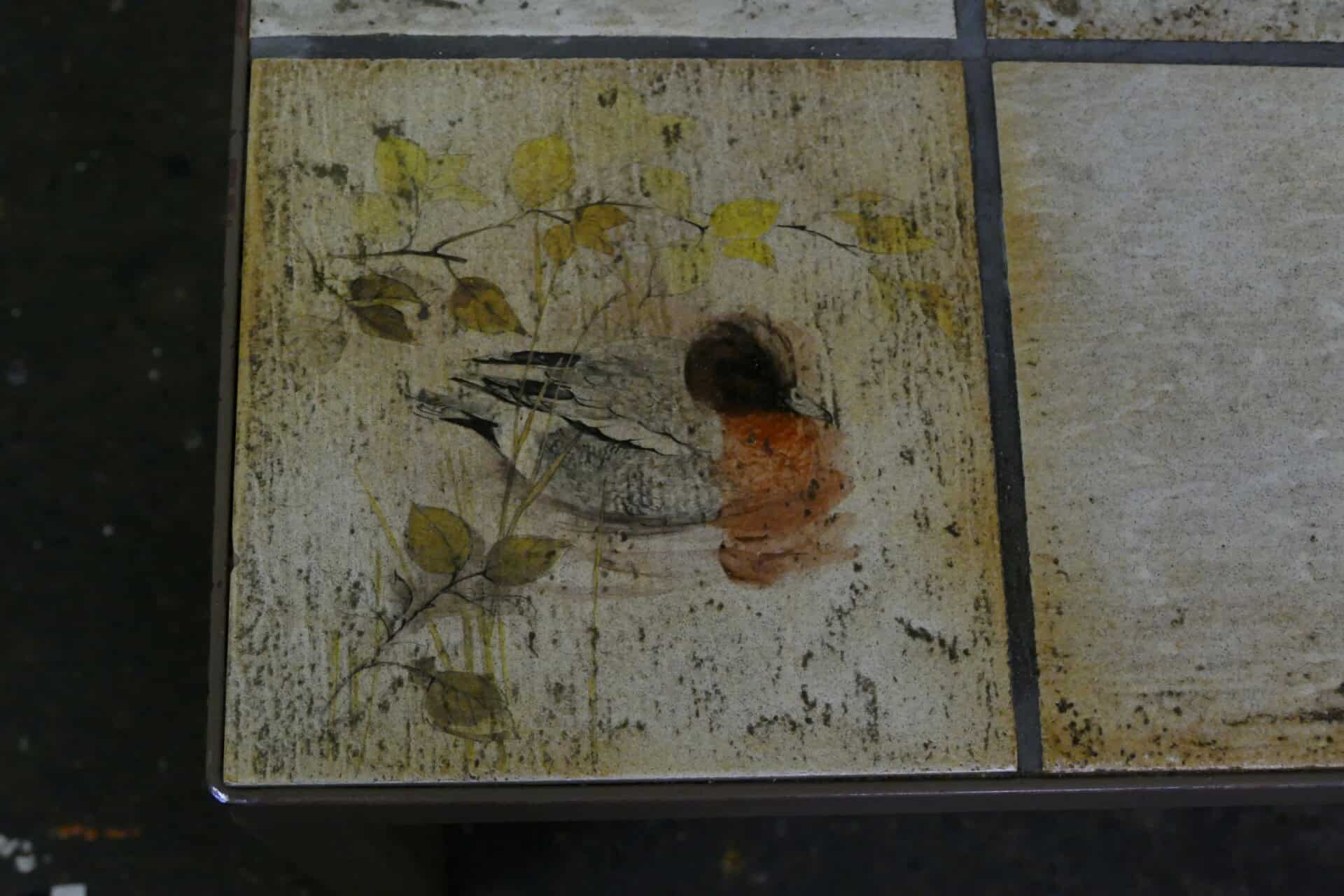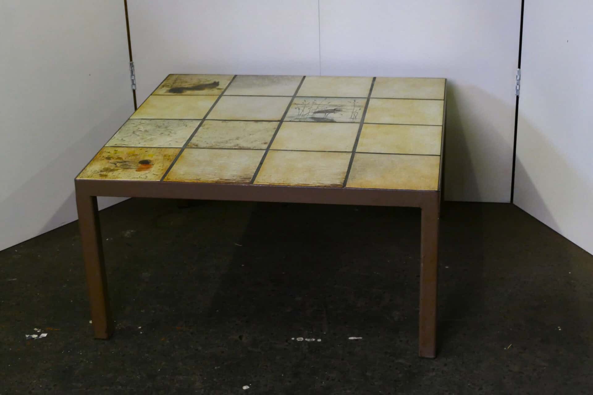 Vierkante salontafel op stalen onderstel met een betegeld blad. Enkele tegels zijn voorzien van een prachtige decoratie. Afmetingen 82 x 82 x 42 cm.