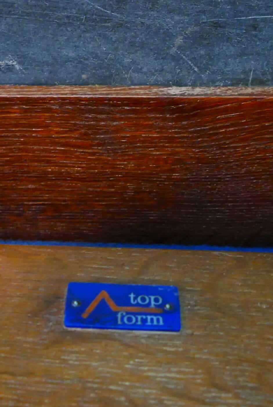 Zware eikenhouten salontafel met een blad van Belgisch hardsteen. Het merk van deze tafel is Topform.