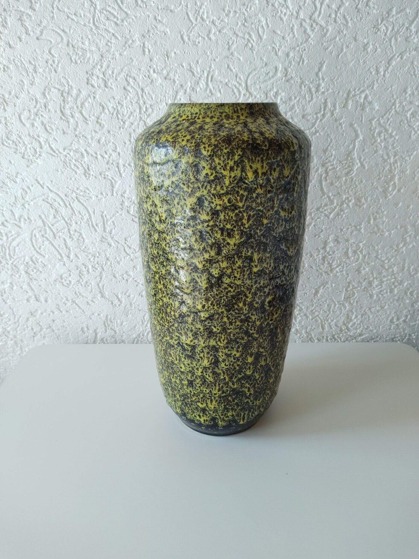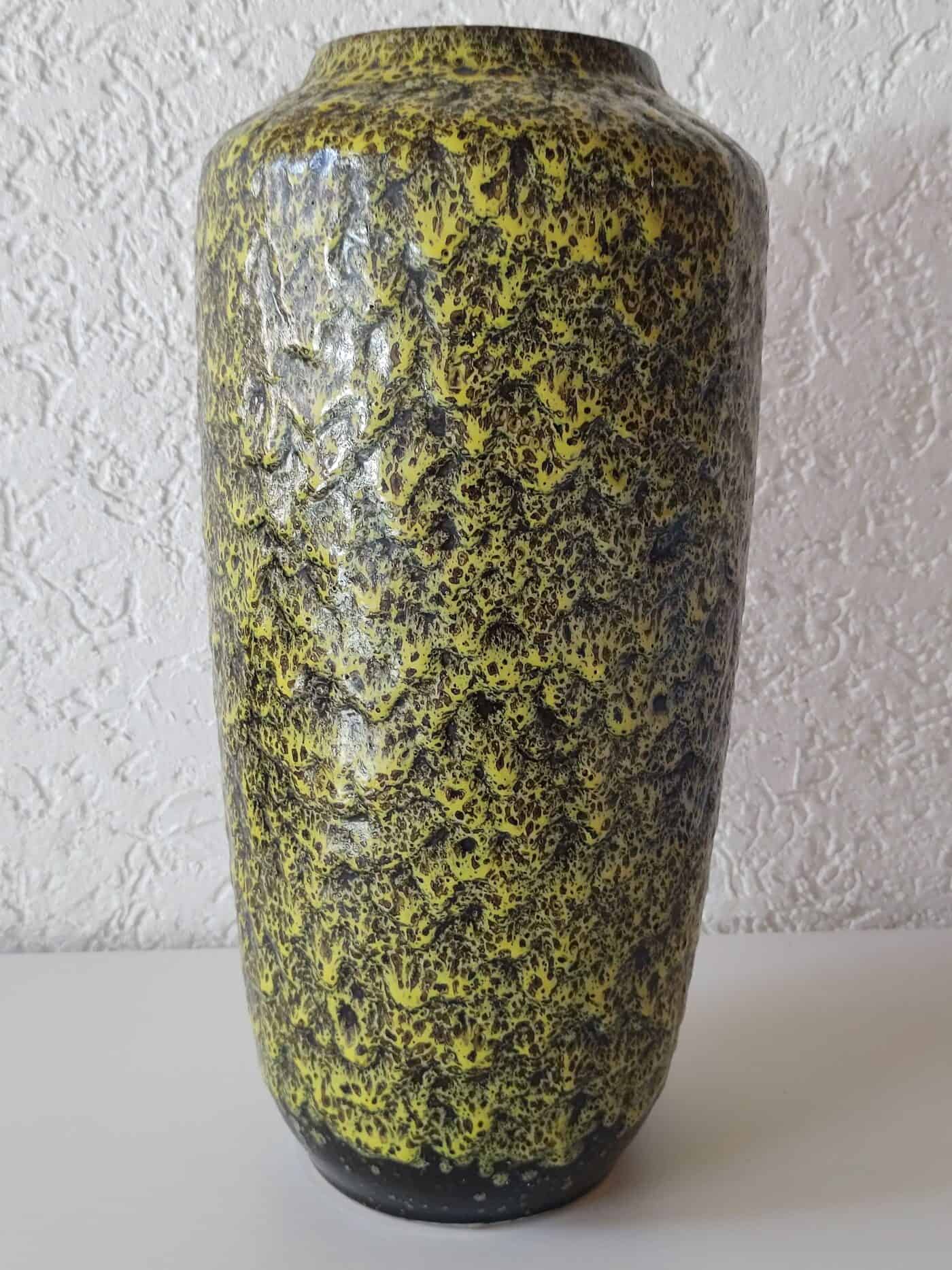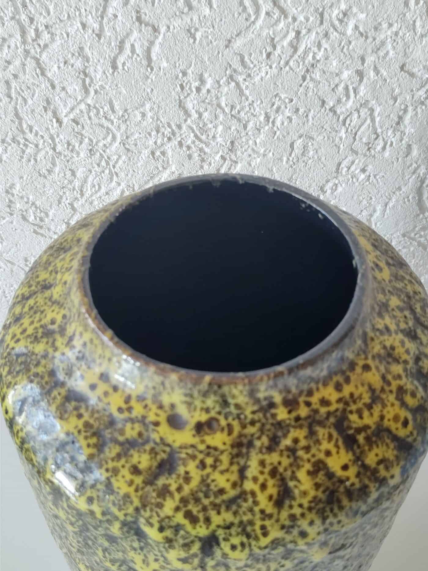 Gave West Germany vloervaas met fraai geel druipglazuur. Het betreft een vaas van Scheurich, 45 cm hoog en een maximale diameter van 20 cm.
