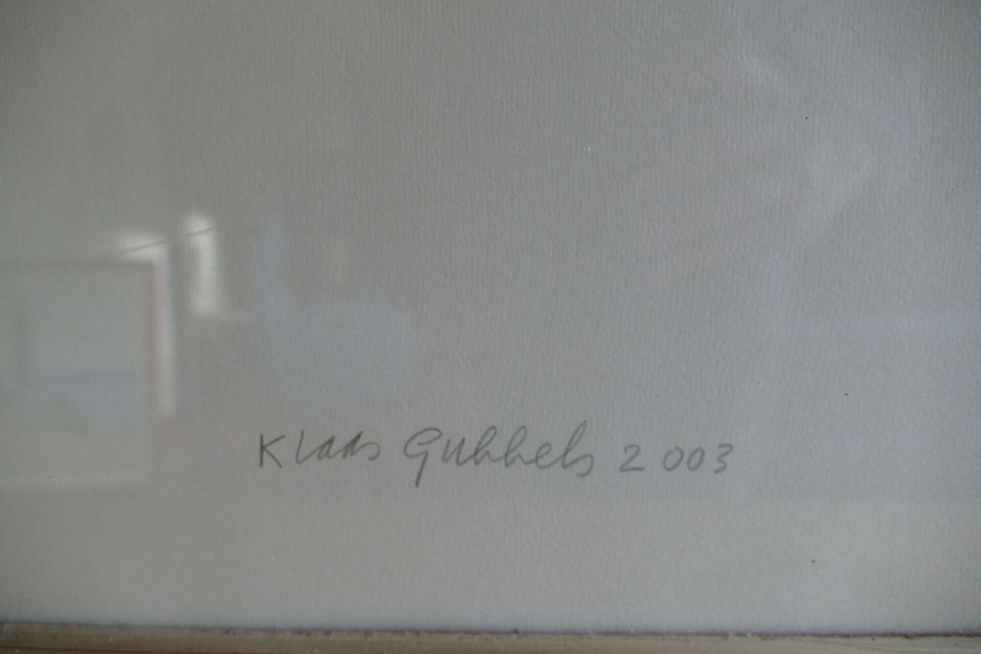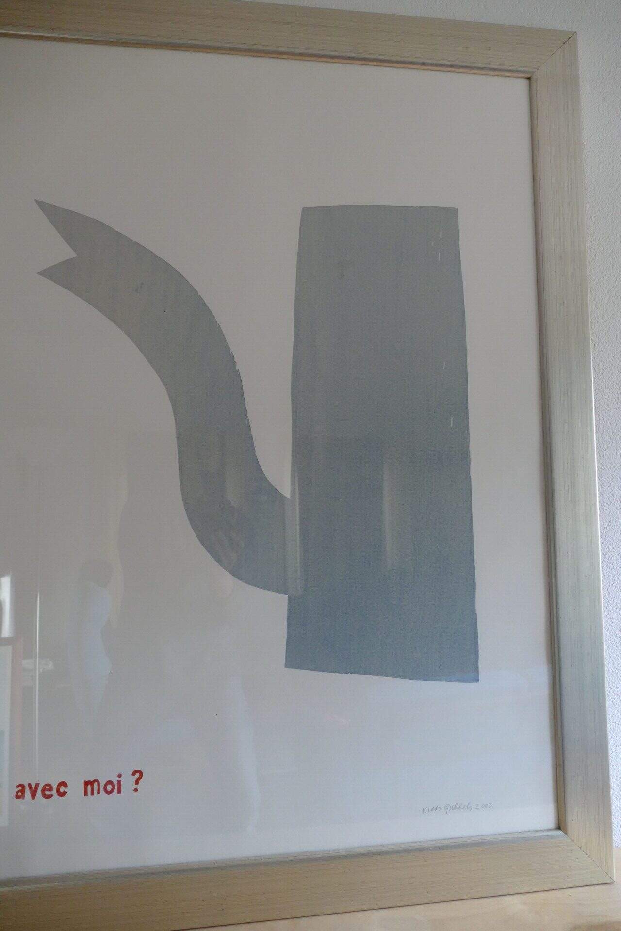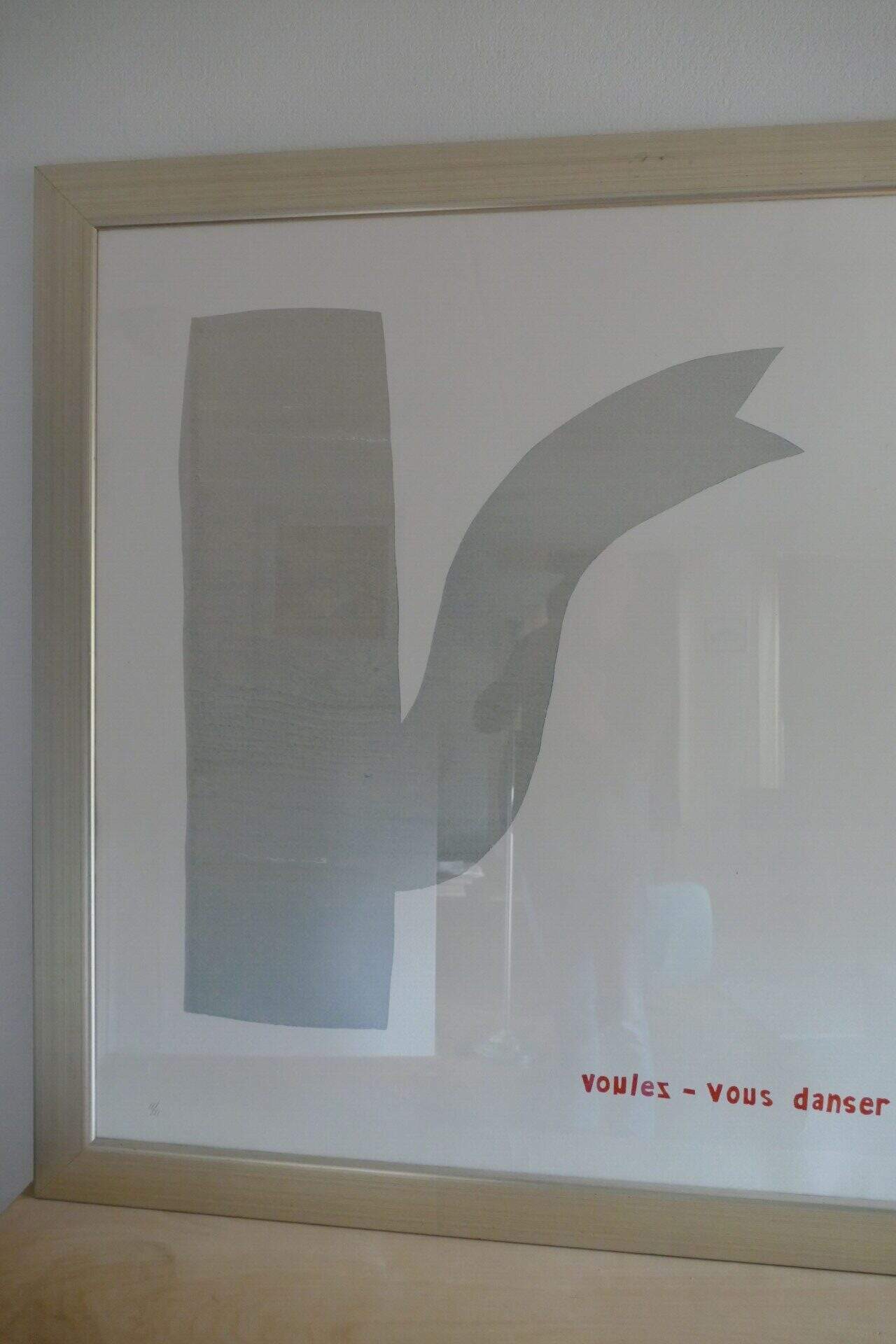 Grote houtdruk getiteld 'voulez vous danser avec moi?' van de hand van Klaas Gubbels uit 2003. Afmetingen inclusief lijst breed 207 en hoog 140 cm. Genummerd 11/11, gedateerd 2003 en gesigneerd. Ingelijst achter plexiglas.