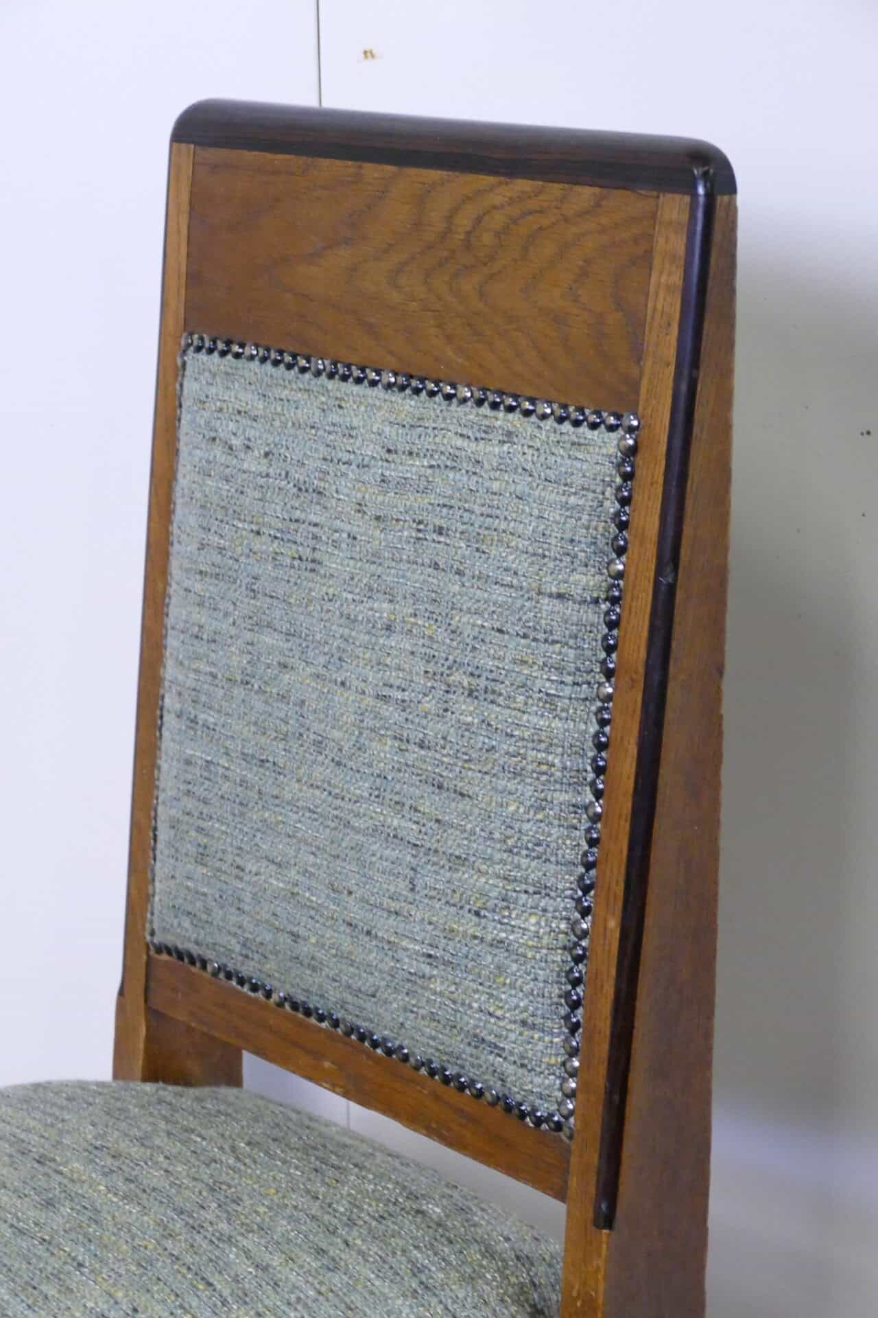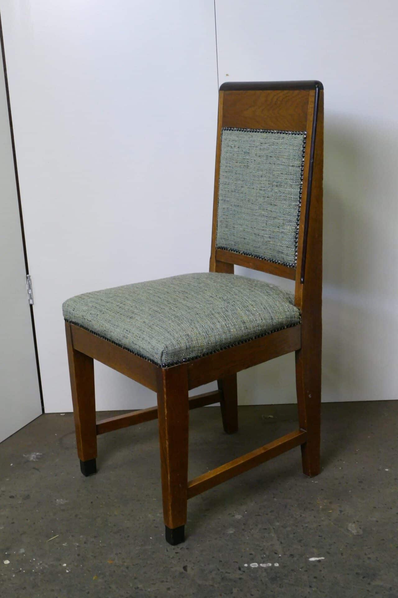 Fraaie set van vier Amsterdamse School eetkamerstoelen. Sobere vormgeving maar opgesierd met een fraai randje coromandelhout langs de rugleuning. De bekleding is in nette staat.