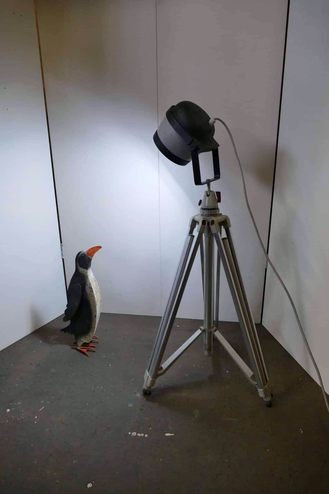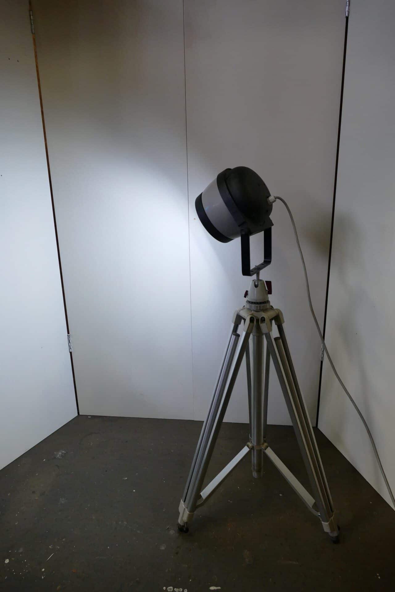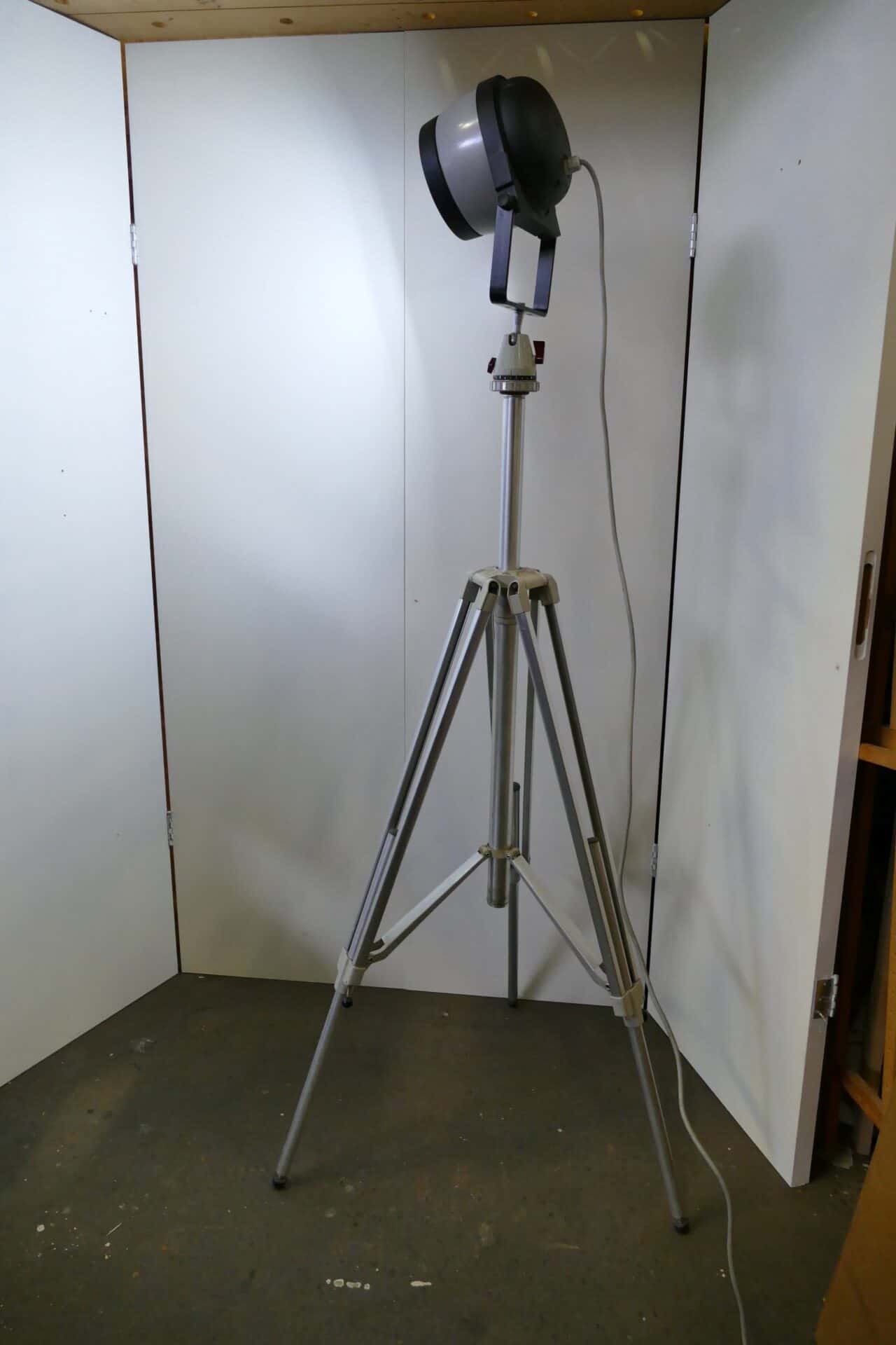 Spotlight gemonteerd op een vintage Linhof statief. De hoogte is te variëren van ca. 1 meter tot ca. 2,20 meter. Voorzien van LED lamp in een R7S fitting.