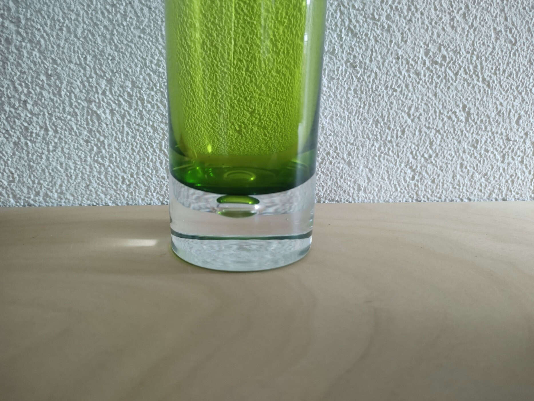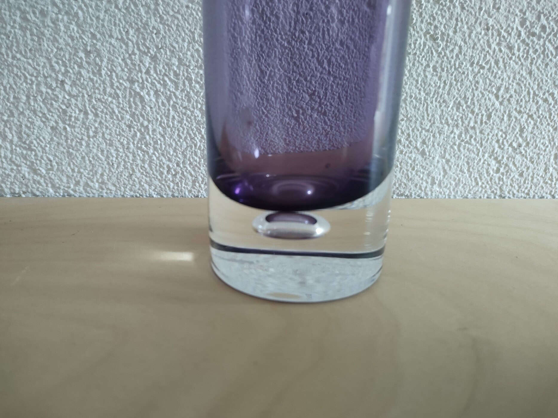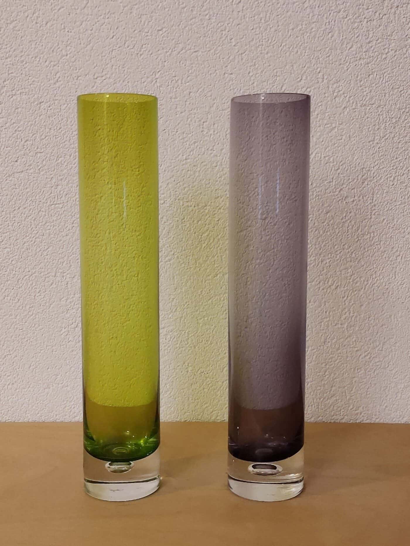 Twee cilindrische vazen van gekleurd glas met zware bodem. Ontworpen door Bo Borgstrom voor Aseda Glasbruk. De bodem is van helder glas met daarin een luchtbel.